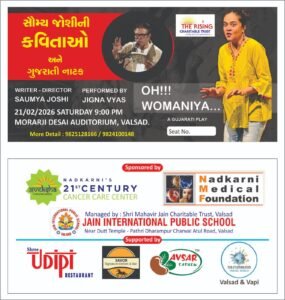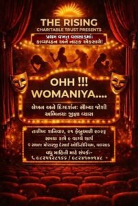 Valsad recently hosted “Oh!!! Womania…”, a powerful Gujarati play blending socially relevant poetry with impactful storytelling. Organized by The Rising Charitable Trust, the performance—written and directed by Saumya Joshi and performed by Jigna Vyas—celebrated emotion, expression, and women’s strength.