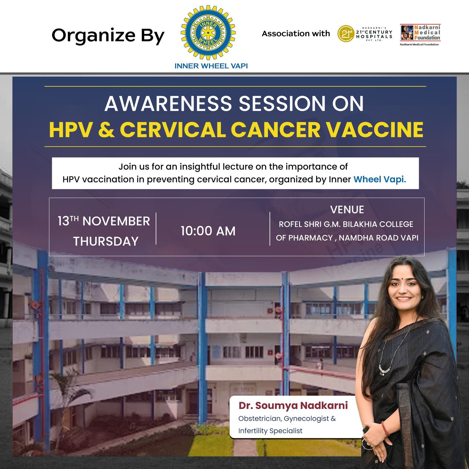 An Awareness Session on HPV & Cervical Cancer Vaccine was successfully organized by Inner Wheel Vapi, in association with 21st Century Hospitals Pvt. Ltd. and Nadkarni Medical Foundation.